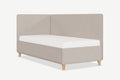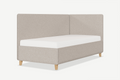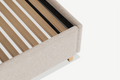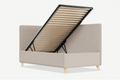 Smukły, miękki i zaokrąglony zagłówek zachwyca czystą formą. Tapicerowana rama łóżka wykonana z najwyższej jakości materiałów oraz dębowe nóżki wykończone naturalnym olejowoskiem. Praktyczny pojemnik znajdujący się pod całą powierzchnią materaca. Otwierany za pomocą sprężyn gazowych. Odpowiednia moc podnośników gwarantuje lekkie i płynne otwieranie.