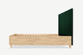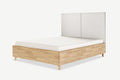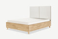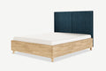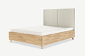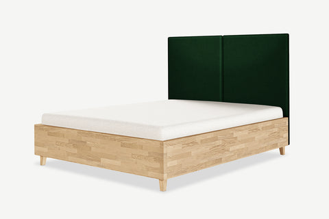 Nami dębowe łóżko z pojemnikiem i zagłówkiem w formie dwóch miękkich paneli tapicerowanych.